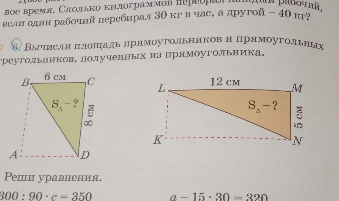 Пошаговое объяснение: в обеих задачах площадь треугольника в два раза меньше площади прямоугольников. поэтому площадь зеленого треугольника (6*8)/2=24/см²/, площадь оранжевого треугольника (12*5)/2=30/см²/