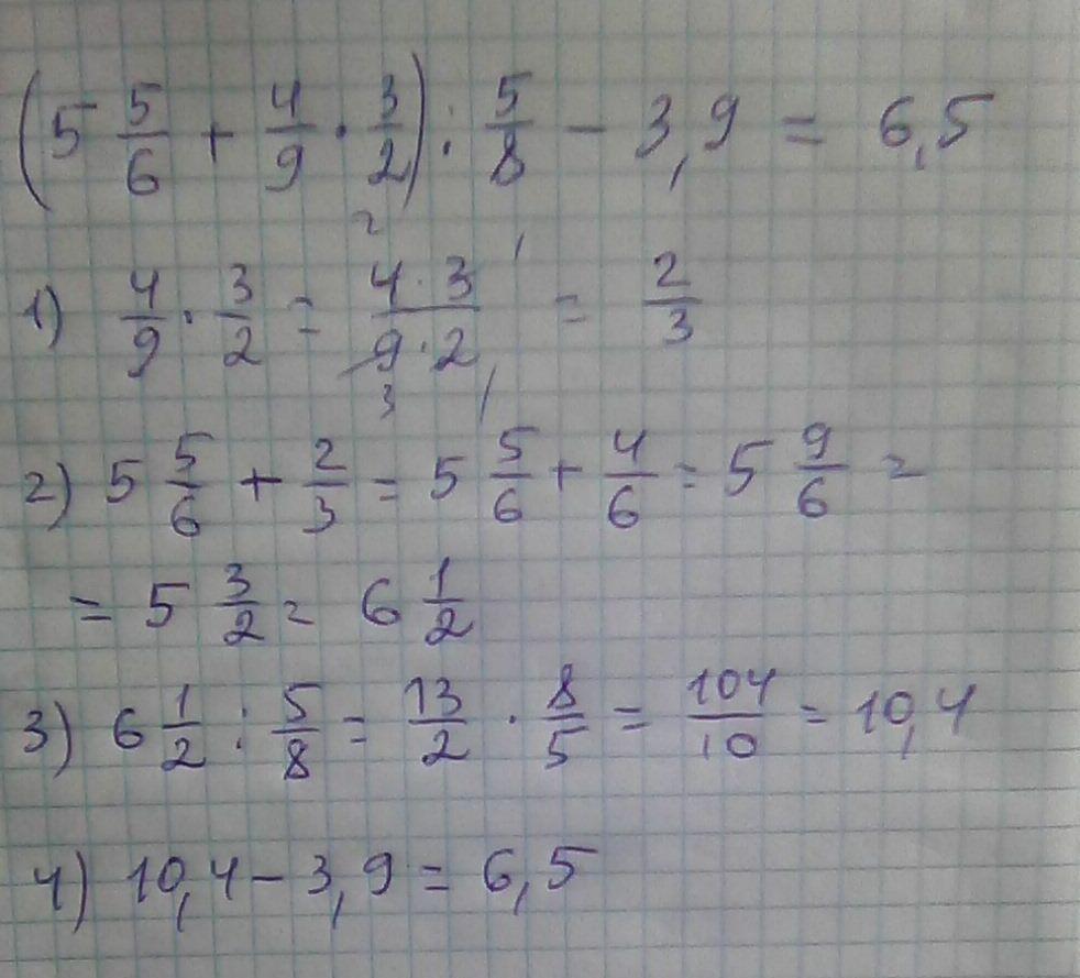 ( 5 целых пять шестых + четыре девятых * на три вторых ) : на пять восьмых - три целых девять десятых