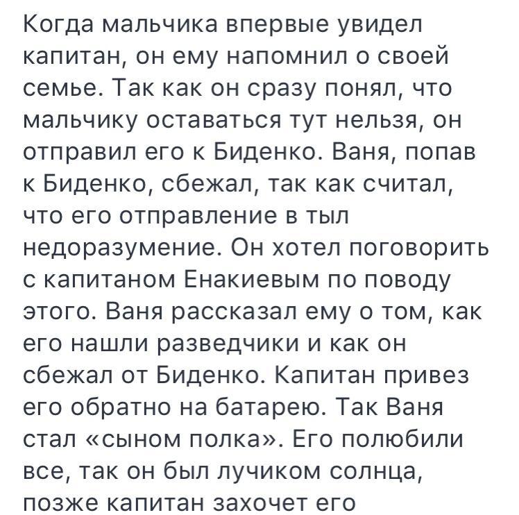 Когда мальчика впервые увидел капитан, он ему напомнил о своей семье. Так как он сразу понял, что мальчику оставаться тут нельзя, он отправил его к Биденко. Ваня, попав к Биденко, сбежал, так как считал, что его отправление в тыл недоразумение. Он хотел поговорить с капитаном Енакиевым по поводу этого. Ваня рассказал ему о том, как его нашли разведчики и как он сбежал от Биденко. Капитан привез его обратно на батарею. Так Ваня стал «сыном полка». Его полюбили все, так он был лучиком солнца, позже капитан захочет его усыновить.