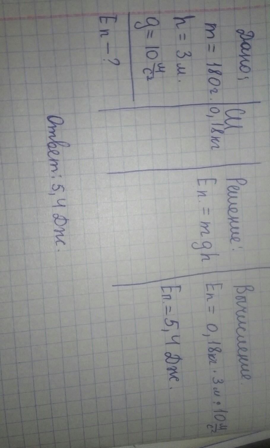 Какой потенциальной энергией относительно поверхности земли обладает яблоко массой 180 г висящее на ветке на высоте 3 метра ?