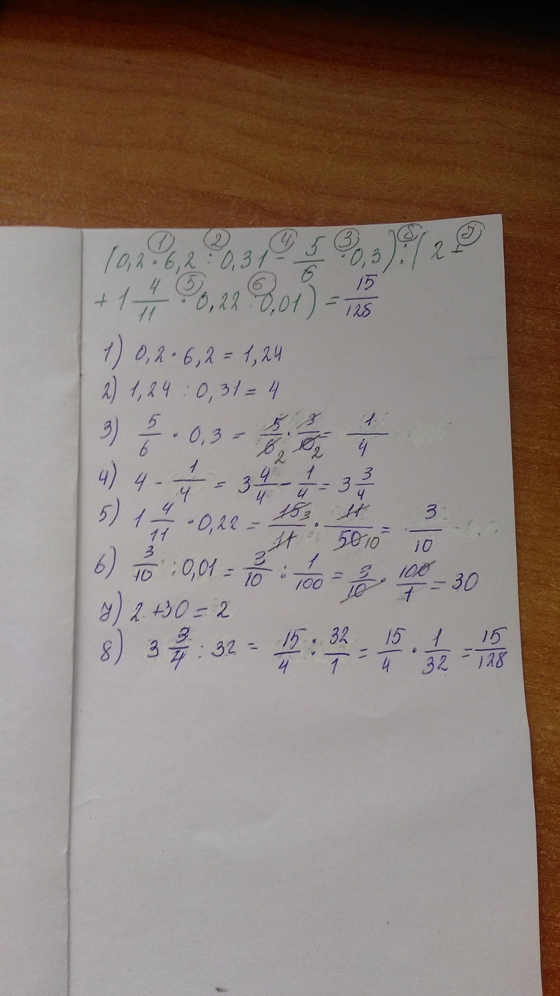 (0,2 × 6,2 : 0,31 - 5/6 × 0,3):(2 + 1 целая 4/11 × 0,22 :0,01) =?