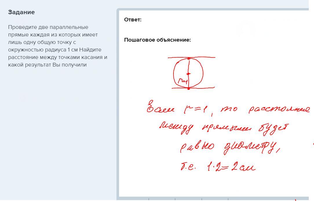 Проведите две параллельные прямые каждая из которых имеет лишь одну общую точку с окружностью радиуса 1 см Найдите расстояние между точками касания и какой результат Вы получили