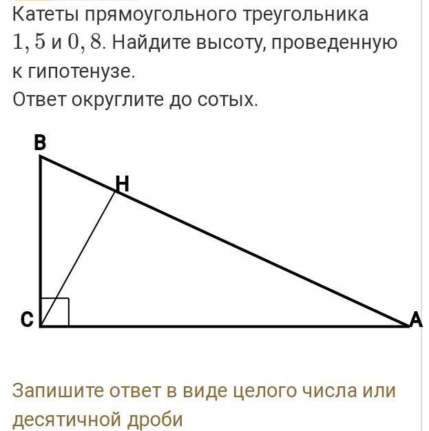 По теореме Пифагора гипотенуза равна 1,7. После по теореме о проекциях BC²=AB*BH найдем BH, он равен 32/85. По теореме Пифагора CH=112/425.