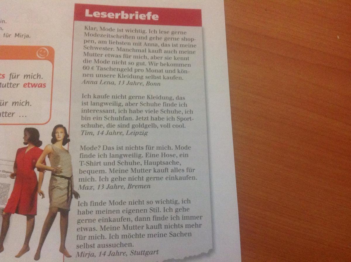 Конечно, мода важна. Я с удовольствием читаю журналы мод и люблю ходить по магазинам больше всего с Анной, это моя сестра. Иногда моя мама покупает что-то для меня, но она не знает моды так хорошо. Мы получаем 60 евро карманных денег в месяц и можем сами купить себе одежду.