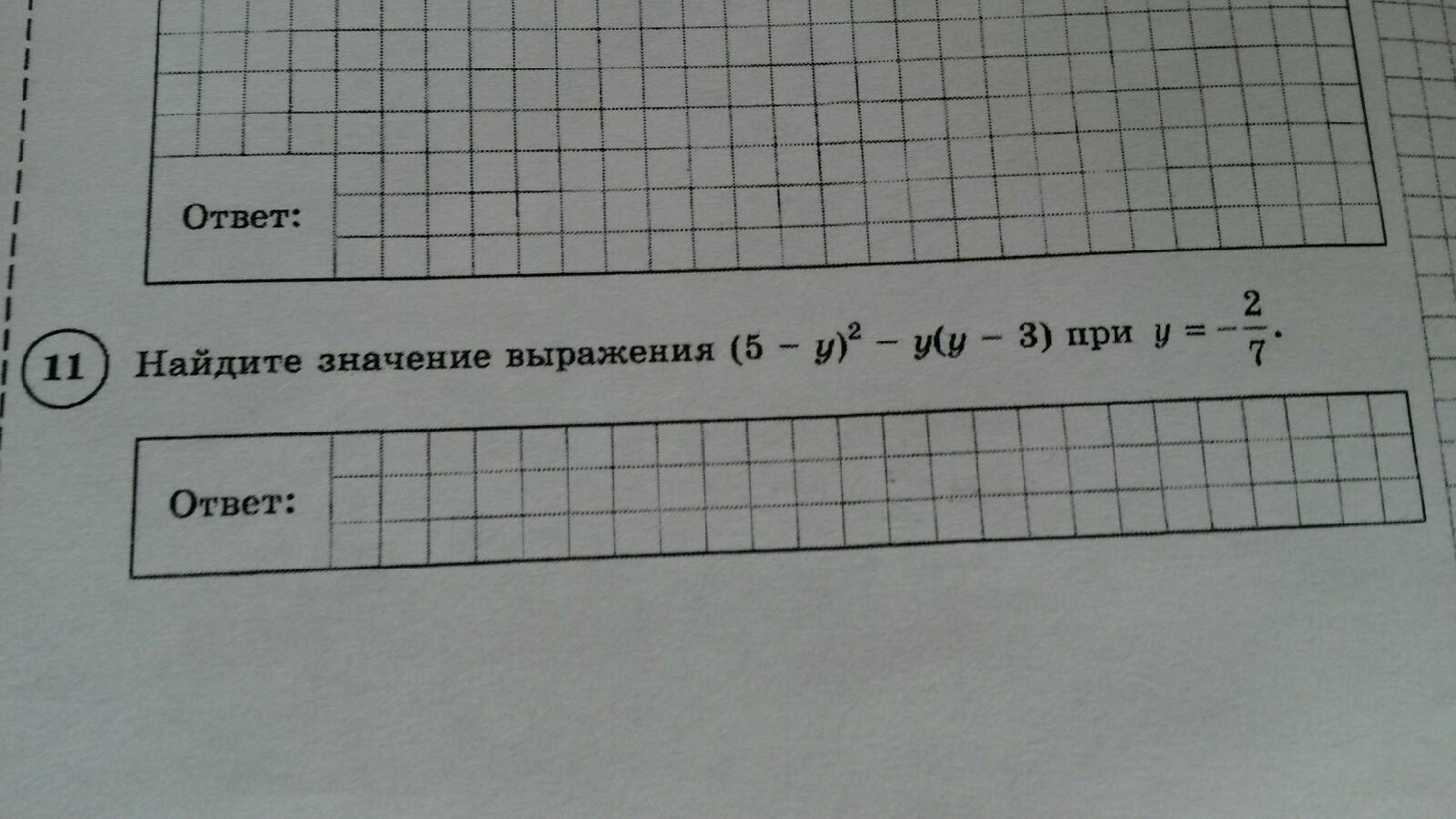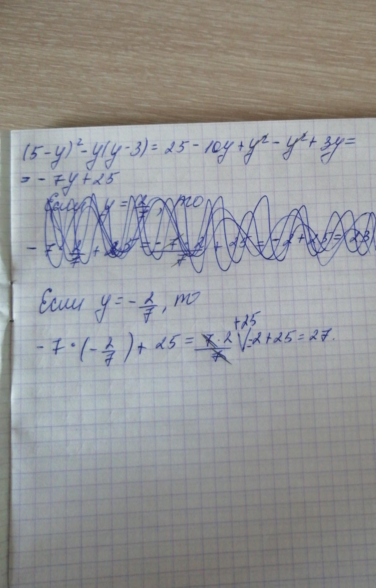 (5 - y)² - y(y - 3) = 25 - 10y + y² - y² + 3y = 25 - 7y