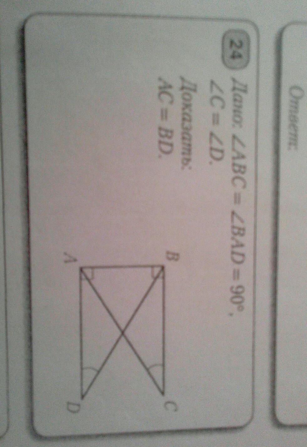 На рисунке изображены два треугольника ΔABC и ΔABD они является прямоугольными. И она равны по теореме УСУ (угол сторона угол), т.к. ∠C=∠D, ∠ABC=∠BAD=90° ⇒ AC=BD.