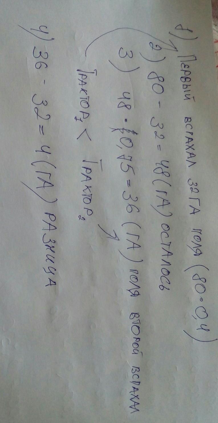 площадь участка поля 80 га .первый трактор вспахал 40% этого участка ,А второй 75% оставшейся части. кто из них вспахал больше И на сколько га ?
