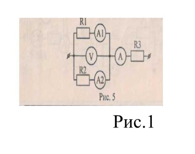 Амперметр А1 показує 1 А (рис.1 нижче) .Які покази вольтметра і амперметрів А2 і А , якщо опори резисторів R1= 4 Ом , R2= 6 Ом ?