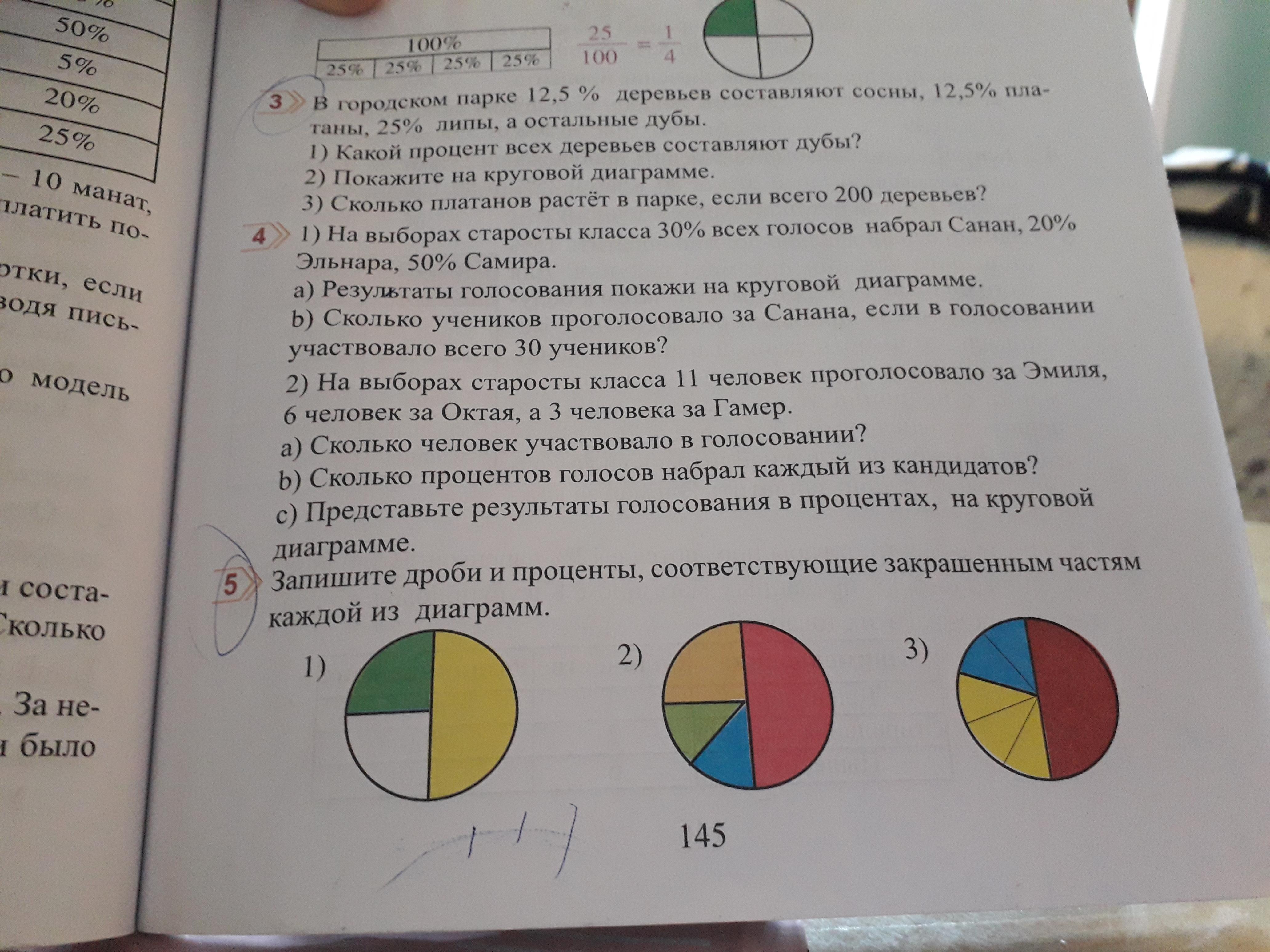 Зелёный-получился разделив кружок по полам и ещё по полам, следовательно 1/4 или 25%