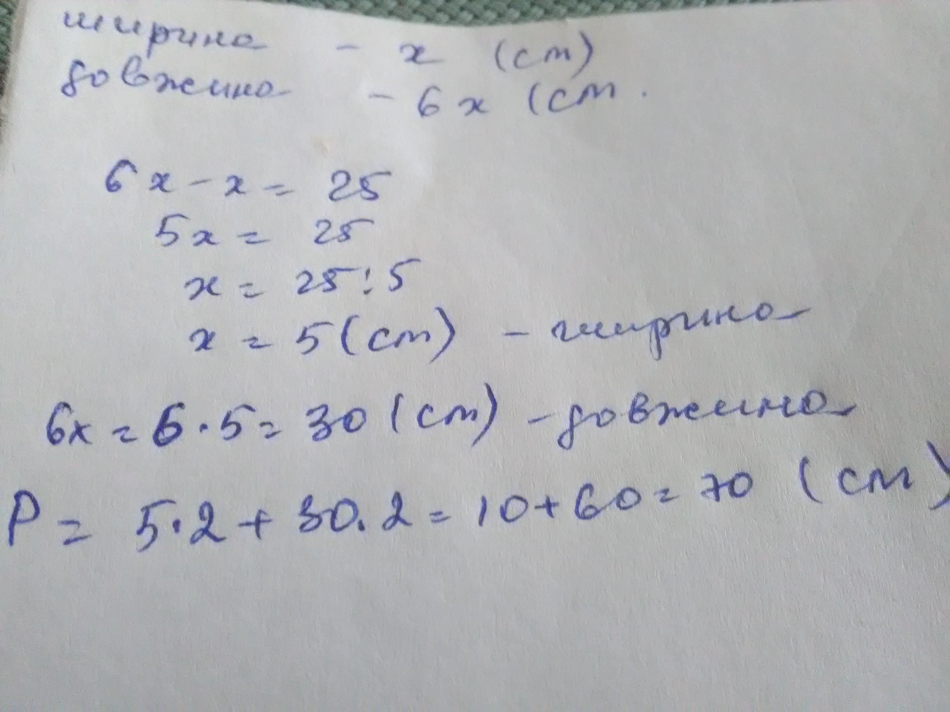Довжина прямокутника в 6 разів більша за його ширину, а ширина прямокутника на 25 м менше його довжини. Знайдіть периметр прямокутника.