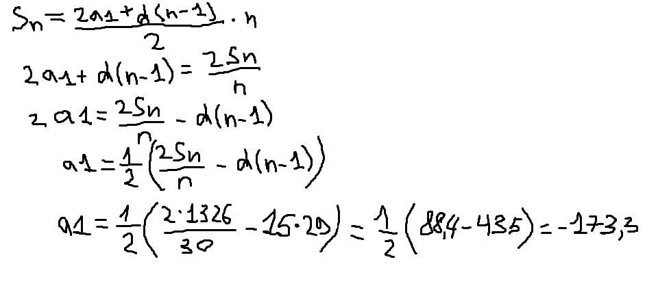 Знайдіть перший член арифметичної прогресії різниця якої дорівнює 15 а сума її перших тридцяти членів дорівнює 1326