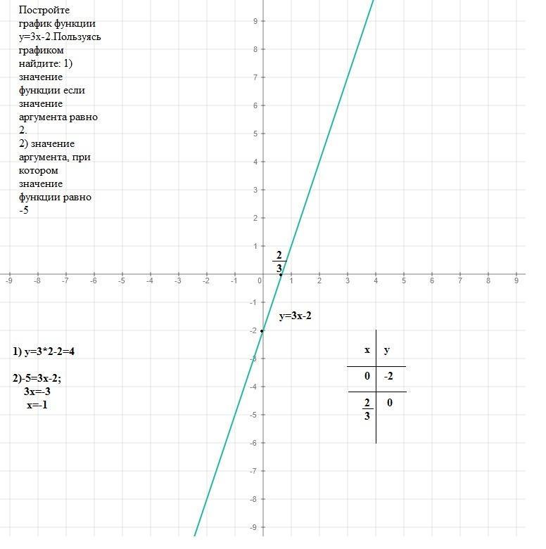 Постройте график функции y=3x+3. Пользуясь графиком, найдите: 1) значение функции, если значение аргумента равно: 1; -2; 0. 2) значение аргумента, при котором значение функции равно: -6; 0; 9. 3) значение аргумента, при которых функция принимает положительные значения.