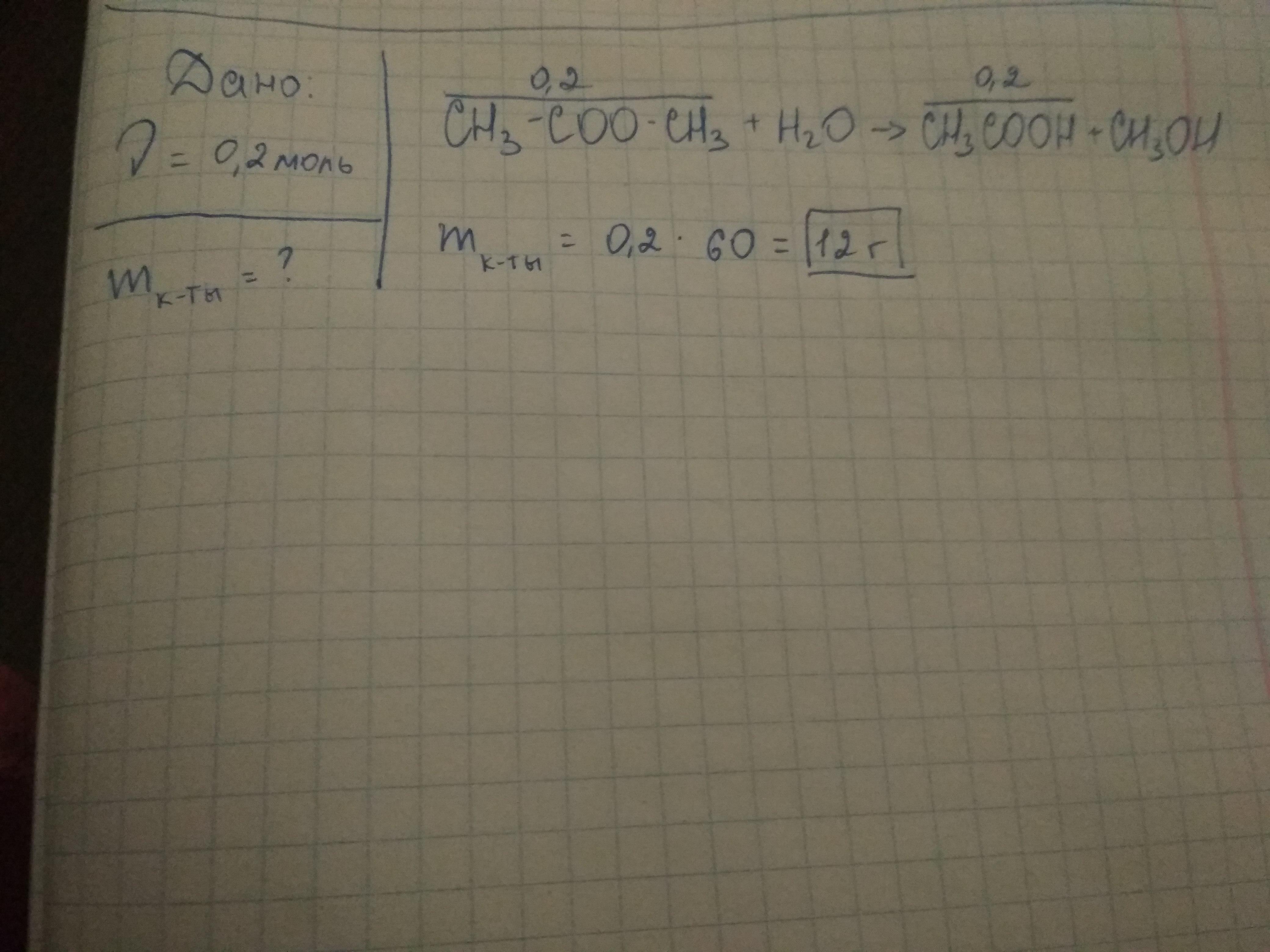 4. Ответ: при гидролизе 0,2моль метилацетата образуется 12г. уксусной кислоты.