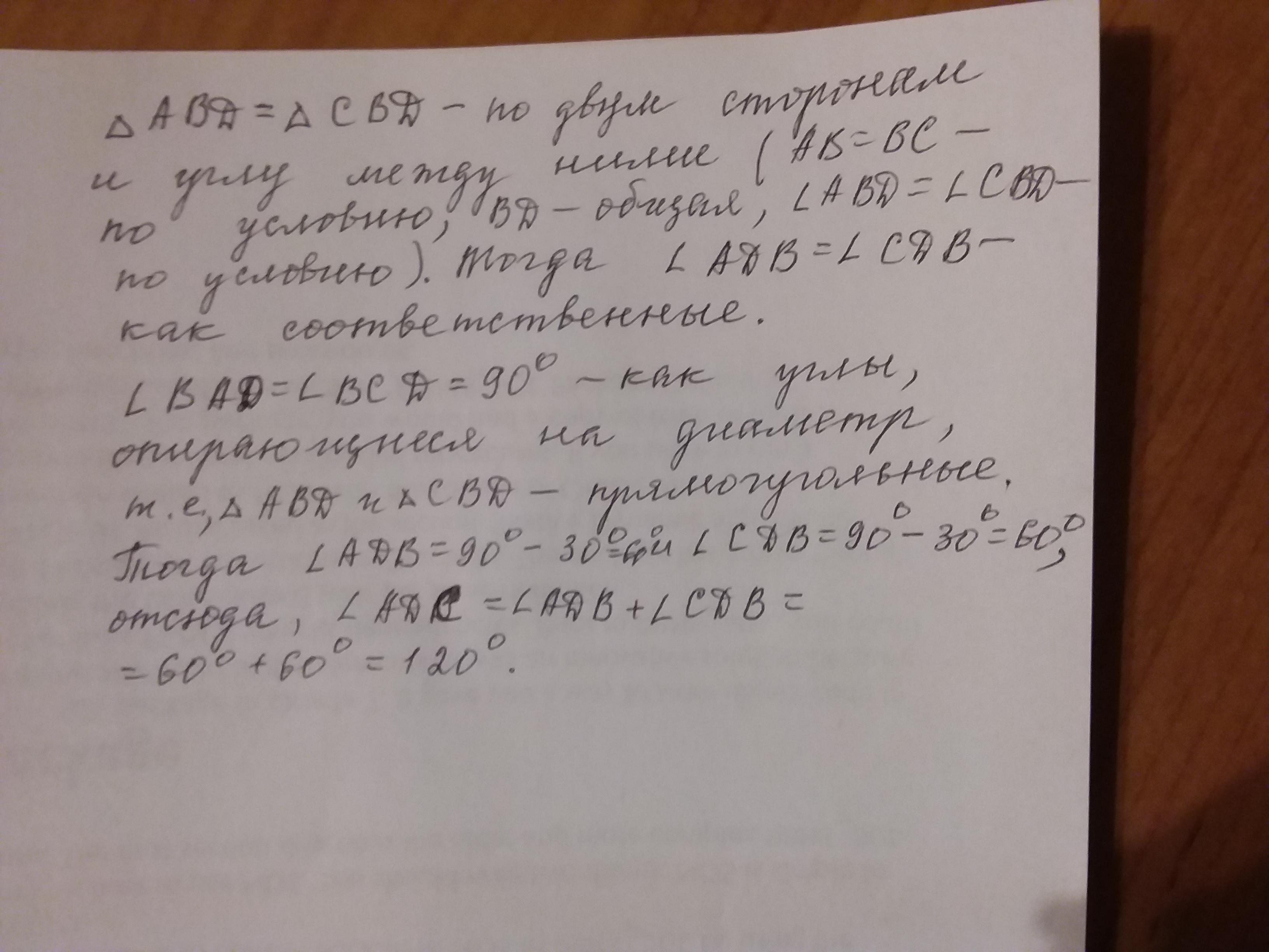 аналогично, вписанные углы ДАС и ДВС равны по 30°, т.к. опираются на одну и ту же дугу ДС, а в ΔАДС два угла по 30°, значит, угол АДС равен 180°-2*30°=120°