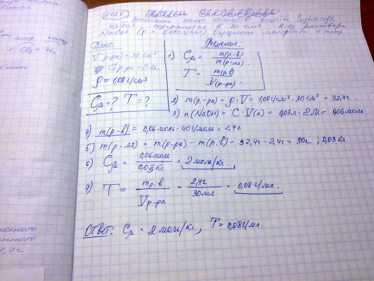 вычислите какое количество вещества гидроксида натрия содержится в 30 см^3 2М раствора NaOH(плотность=1,080 г/см^3). определите моляльную концентрацию NaOH и титр этого раствора