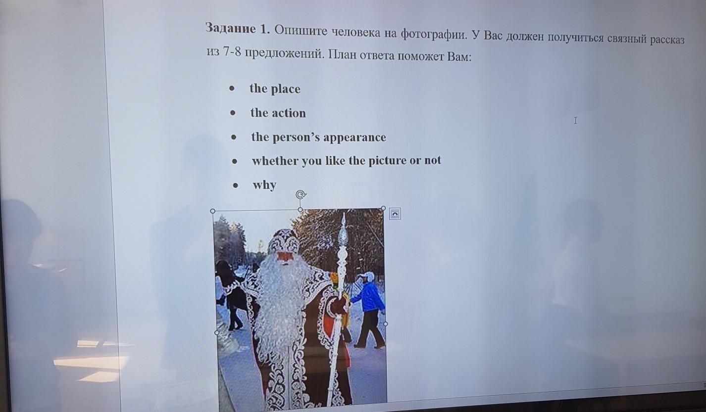 The action on this picture takes place somewhere in Russia in wintertime. The action itself means a celebrating of a New Year. The person on this picture has an unusual appearance - he is a little obesed, his nose is red and he wears a white beard.