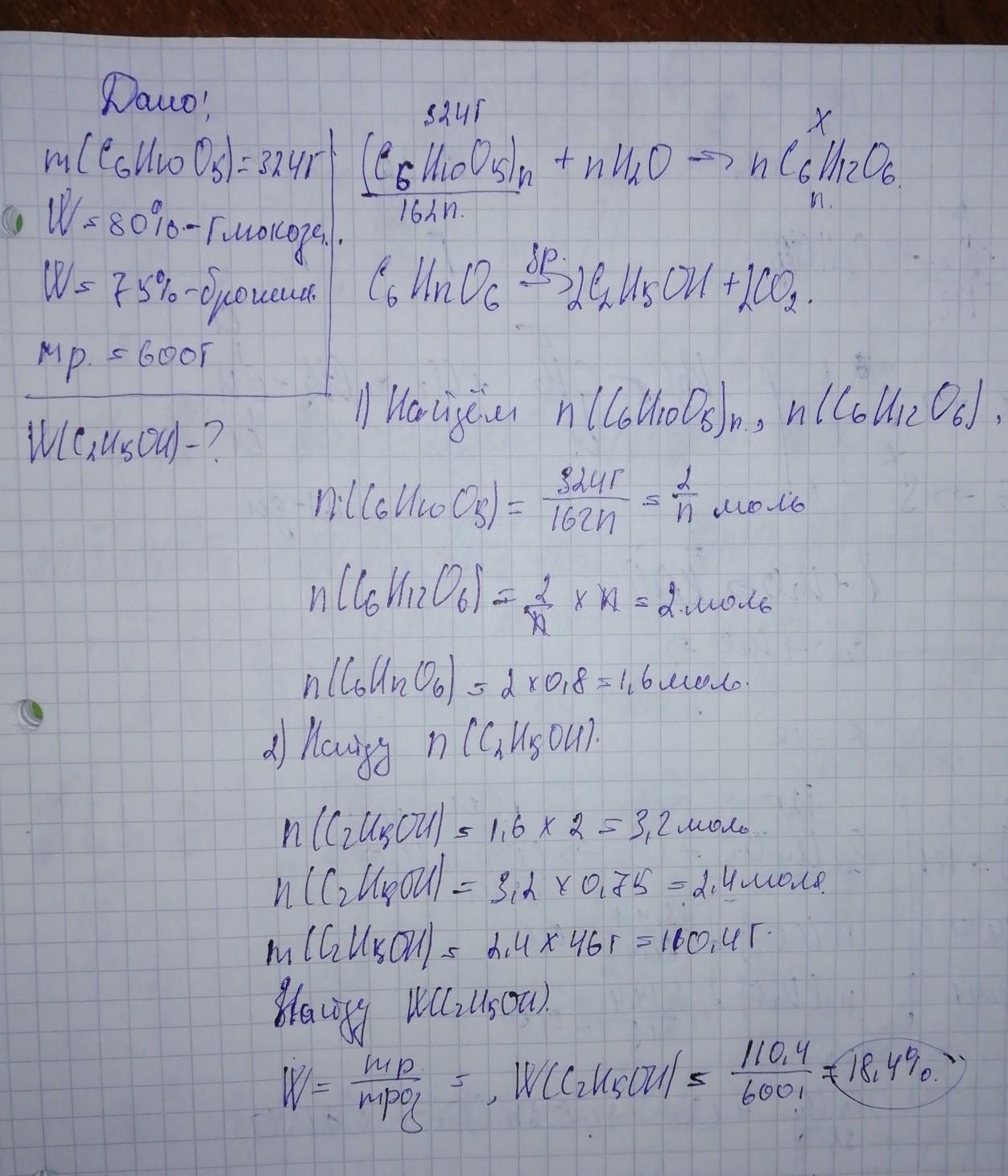 При гидролизе крахмала массой 324 грамма с выходом 80% получили глюкозу, которую подвергли спиртовому брожению, выход продукта брожения составил 75%. В результате образовался водный раствор спирта массой 600 г. Определить массовую долю этанола в растворе.