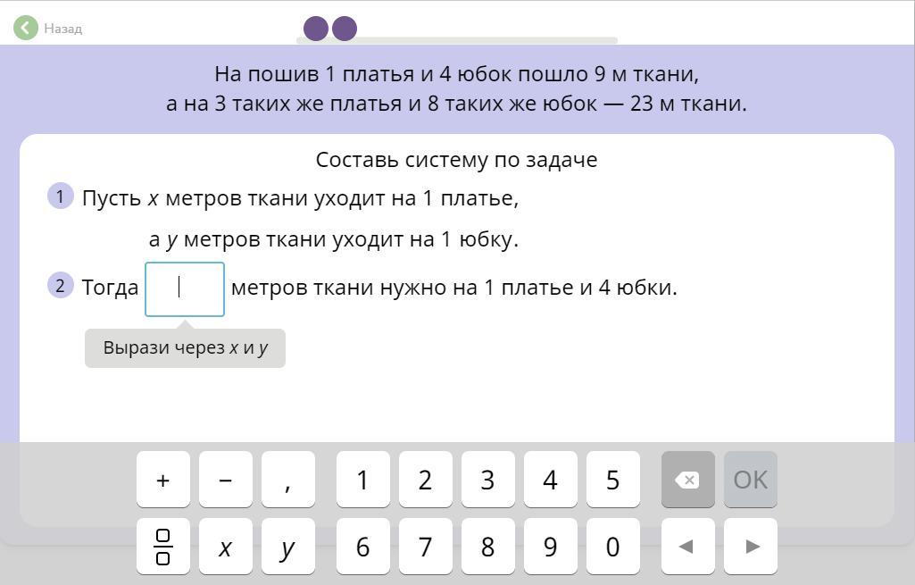 Тогда x+4y метров ткани нужно на 1 платье и 4 юбки