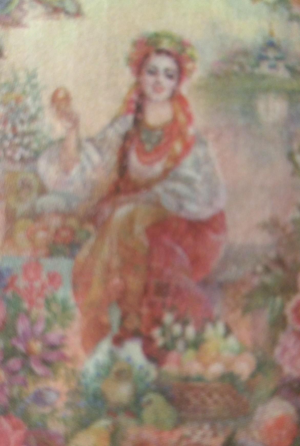 Гарна,темні очі, ніжна усмішка, темна густа коса, чорні брови, у національному українському одязі