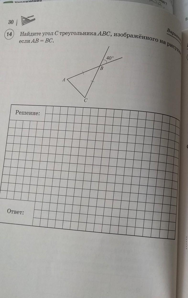 Угол В равен 40 градусов как вертикальный. Т.к. сумма углов треугольника равна 180 градусов 180-40 равно 120. Т.к. АВ равно ВС значит треугольник АВС равнобедренный. По свойствам равнобедренного треугольника угол А равен углу С, значит 120:2 равно 60.