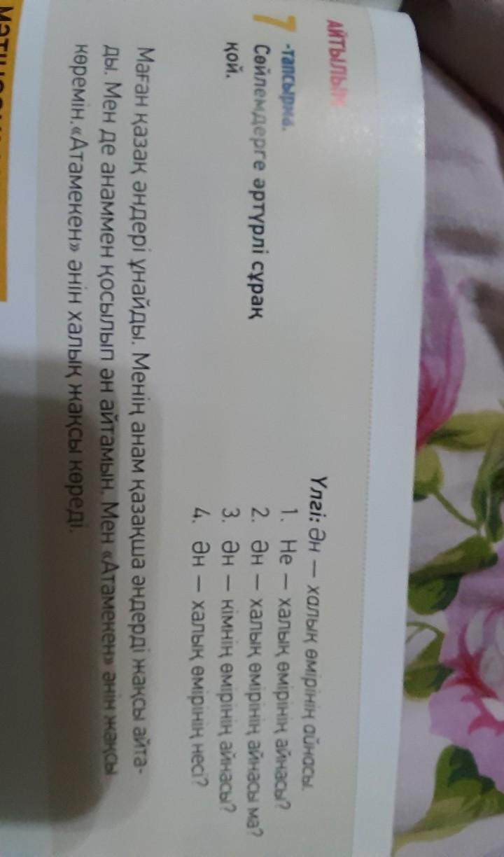 1,Саған қазақ әндері ұнайма?2. Сенің анаң қазақ әндерін жаксылап айтама?3.Сен анаңмен қосылып айтасың ба?4. Сен ,, Атамекен'' әнін жақсы көресің бе? 5. ,, Атамекен'' әнің халық жақсы көремін?