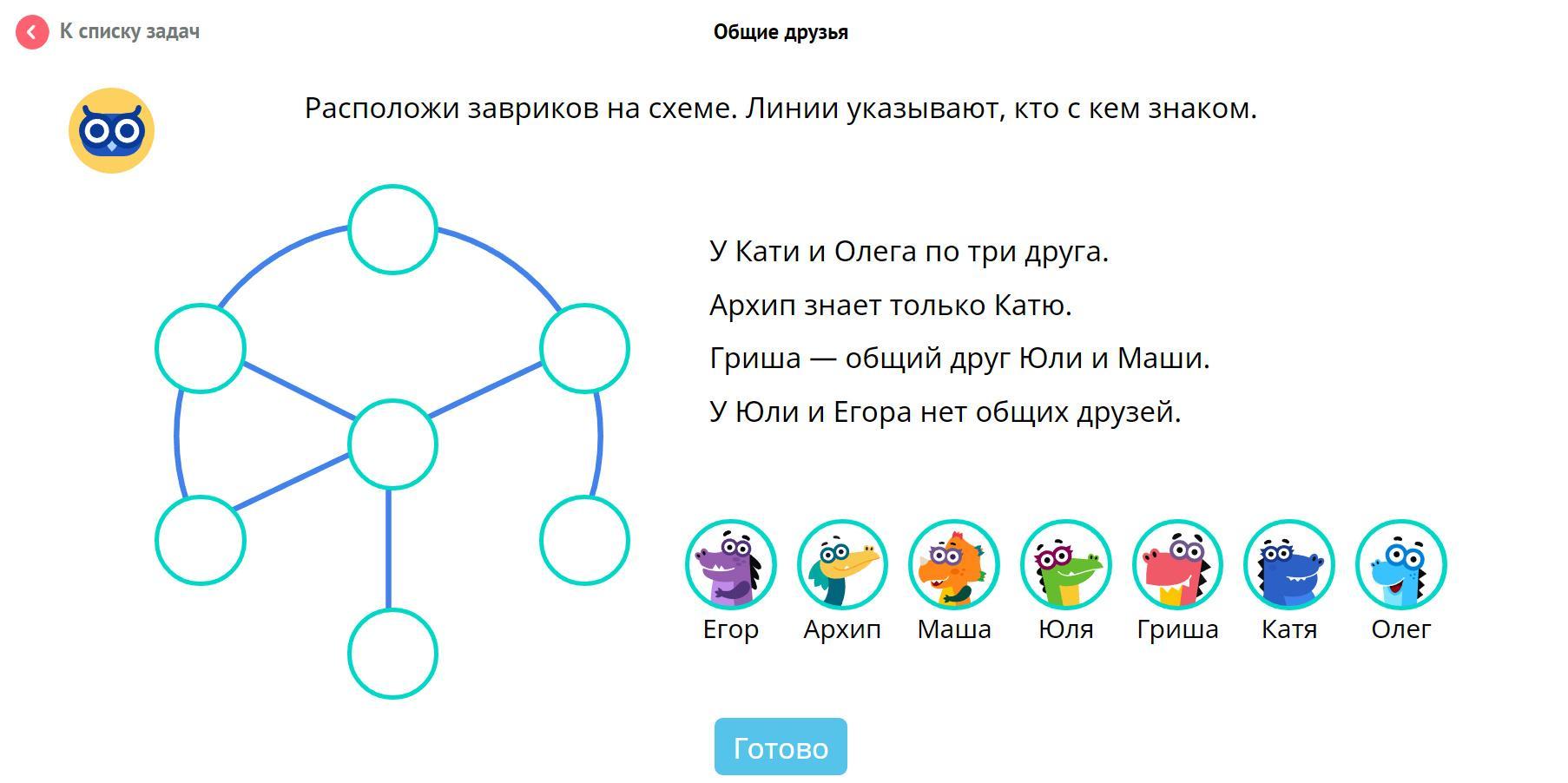 4 У Юли и Егора нет общих друзей.( их без разницы куда ставить нижний и верхний кружок ( от них не идут стрелочки к общим друзьям (