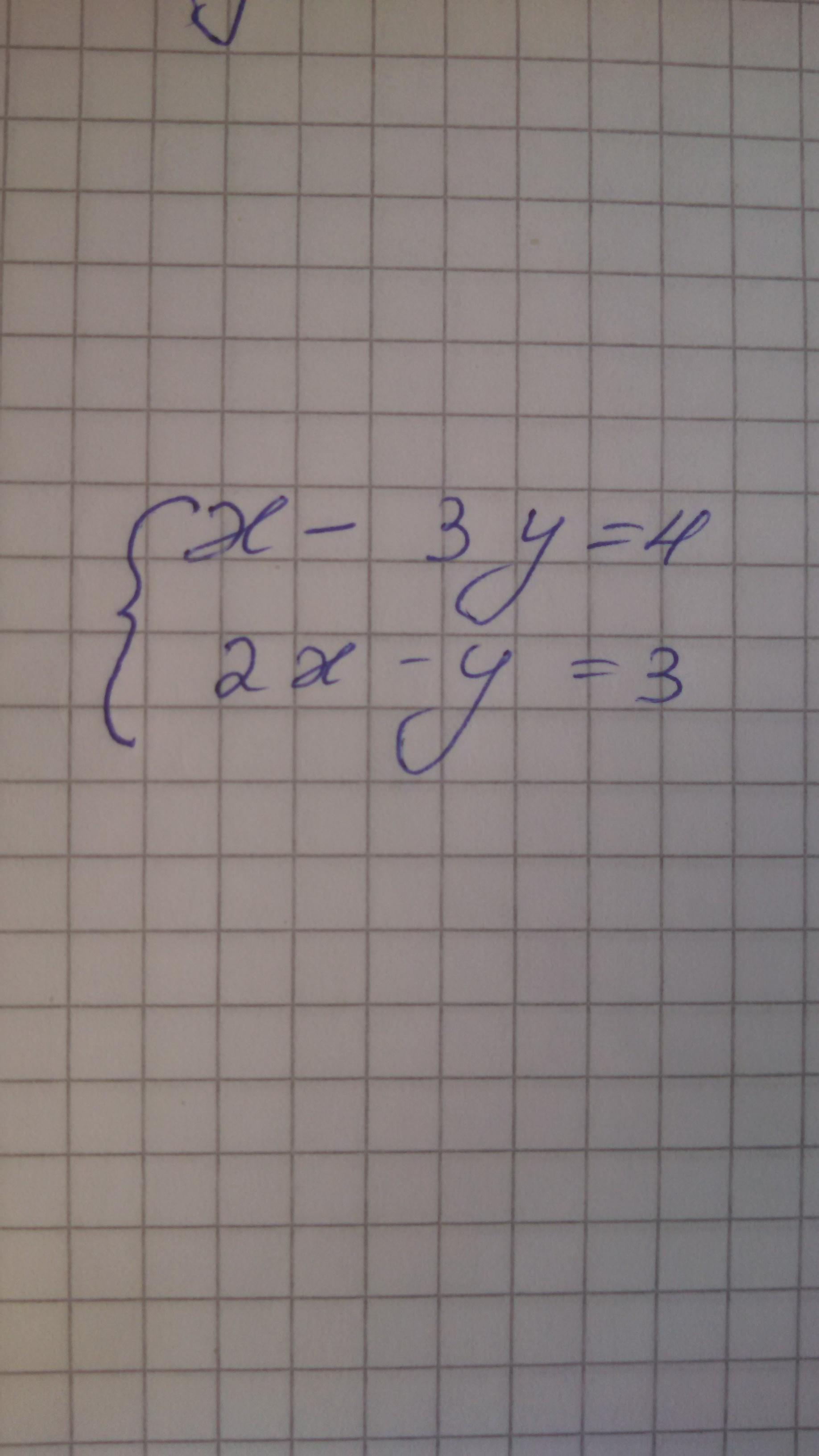 x=3y+4. подставляем во 2 уравнение системы: 2*(3y+4)-y=3; 6y-y+8=3; 6y-y=3-8; 5y= -5; y=(-5)/5= -1. x=3*(-1)+4= -3+4=1. Ответ: (1: -1).