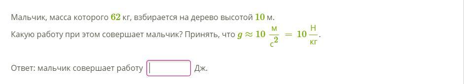 Ответ: работа равна Fs =F=mg=62×10=620Н=620×10=6200Дж.