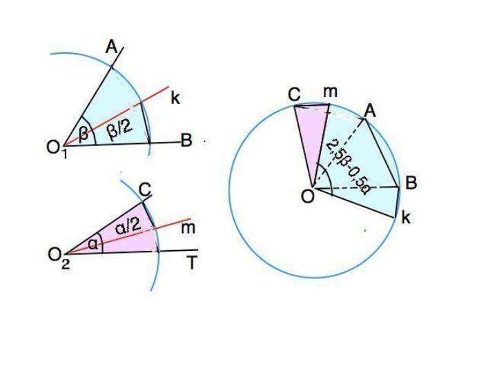 Отложим на той же окружности дугу Сm, равную половине угла α, от т.С в пределах угла СОА. Получившийся угол mОk равен требуемому по условию .2,5 β - 0,5 α (на рисунке он окрашен голубым цветом)