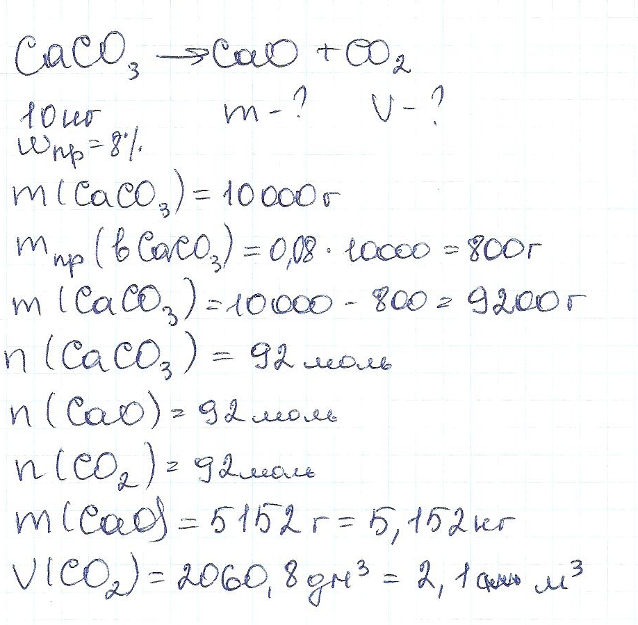 Определите массу оксида кальция и объём углекислого газа, которые образуются при разложении 10 кг известняка с массовой долей примесей 8 % CaCo3 - CaO+CO2