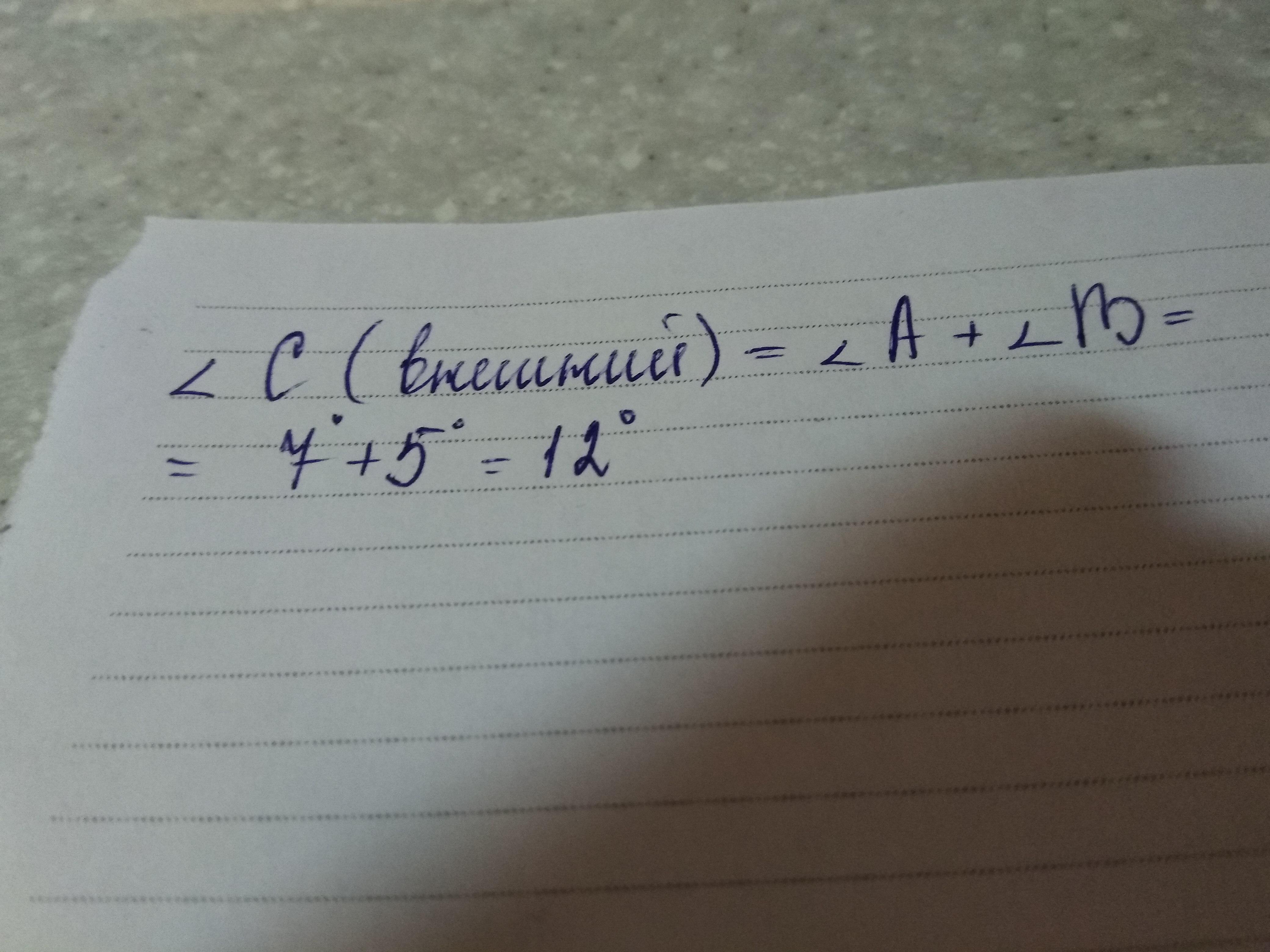треугольники ABC угол А равен 7 градусов а угол B равен 5 градусов найти внешний угол при вершине C