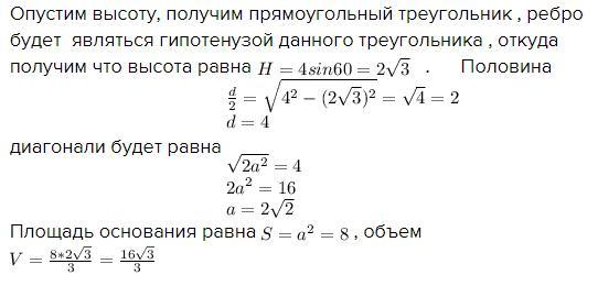 боковое ребро правильной четырехугольной пирамиды 4 см,оно образует с плоскостью основания угол 60 градусов.Вычислить объем пирамиды