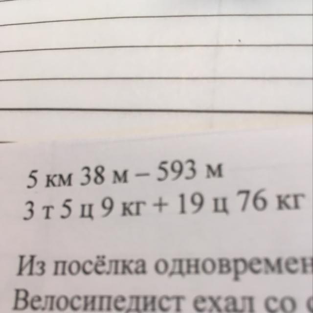 5км 38м-593 м= 5038м - 593м= 4445м;
