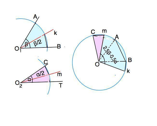Отложим на той же окружности дугу Сm, равную половине угла α, от т.С в пределах угла СОА. Получившийся угол mОk равен требуемому по условию .2,5 β - 0,5 α (на рисунке он окрашен голубым цветом)