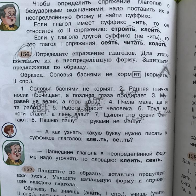 2. Ранняя птичка носик прочища[ет] (прочищать, I спр.). 3. Муравей не велик, а горы копа[ет] (копать, I спр.). 4. Пчела мала, да и та работа[ет] (работать, I спр.). 5. Работа крас[ит] человека (Красить, II спр.). 6. Труд на ноги став[ит] (Ставить, II спр.), а лень вал[ит] (Валить, II спр.). 7. Цыплят по осени счита[ют] (считать, I спр.). Пашню паш[ут] (Пахать, I спр.). - руками не маш[ут] (Махать I спр.).