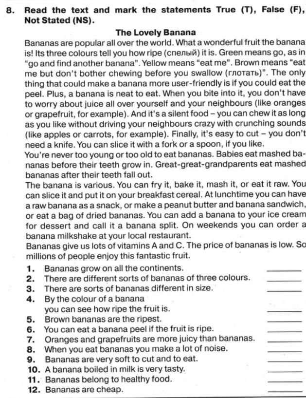Бананы Lovely Banana популярны во всем мире. Какой замечательный фрукт банан! Его три цвета говорят вам, насколько он спелый (спелый). Зеленый означает «иди, как иди и найди другой банан». Желтый означает «съешь меня». Коричневый означает «съешь меня», но не жуй, пока не проглотишь (глотать) .. Единственное, что может сделать банан более удобным для пользователя - дружественным является то, что вы можете съесть кожуру. Плюс, банан аккуратен в еде. Когда вы кусаете его, вам не нужно беспокоиться о соке на всем протяжении себя и своих соседей (например, апельсинов или грейпфрутов). это тихая еда - вы можете жевать ее сколько угодно, не сводя с ума соседей хрустящим звуком (например, яблоки или морковь). Наконец, его легко нарезать - вам не нужен нож. Вы можете нарезать его с помощью вилка или ложка, если хотите, Вы никогда не были слишком молоды или слишком стары, чтобы есть бананы. Младенцы едят пюре из нан, прежде чем их зубы вырастут. Прапрабабушки и бабушки едят бананы из пюре после выпадения зубов. Вы можете жарить, запекать, делать пюре или есть в сыром виде. Вы можете нарезать ломтиками и положить их на хлопья для завтрака. В обед вы имейте сырой банан как закуску, или сделайте арахисовое масло и банановый бутерброд или съешьте мешок высушенных бананов. Вы можете добавить банан к своему ледяному креану на десерт и назвать это банановым сплитом. По выходным вы можете заказать банановый молочный коктейль в местном ресторане. Бананы дают нам много витаминов А и С. Цена на бананы низкая. Миллионы людей наслаждаются этим фантастическим фруктом.
