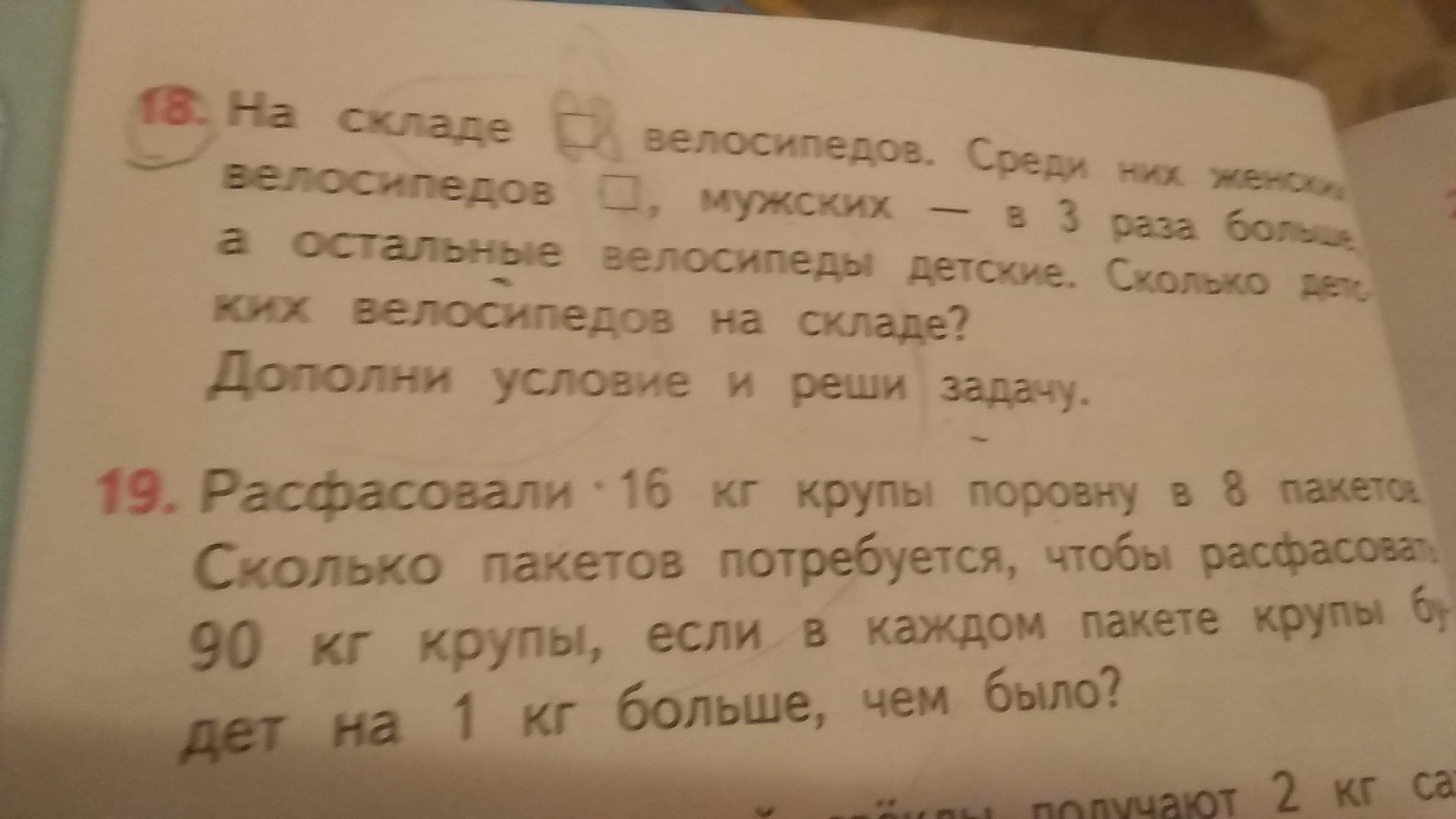 Пошаговое объяснение:На складе 18 велосипедов.Женских-3,а мужски-?-в 3 раза больше.Детских-?-остальные. 1)3* 3=9(в)-мужских; 2)3+9=12(в)--жен.и мужск. 3)18-12=6(в)- детских.