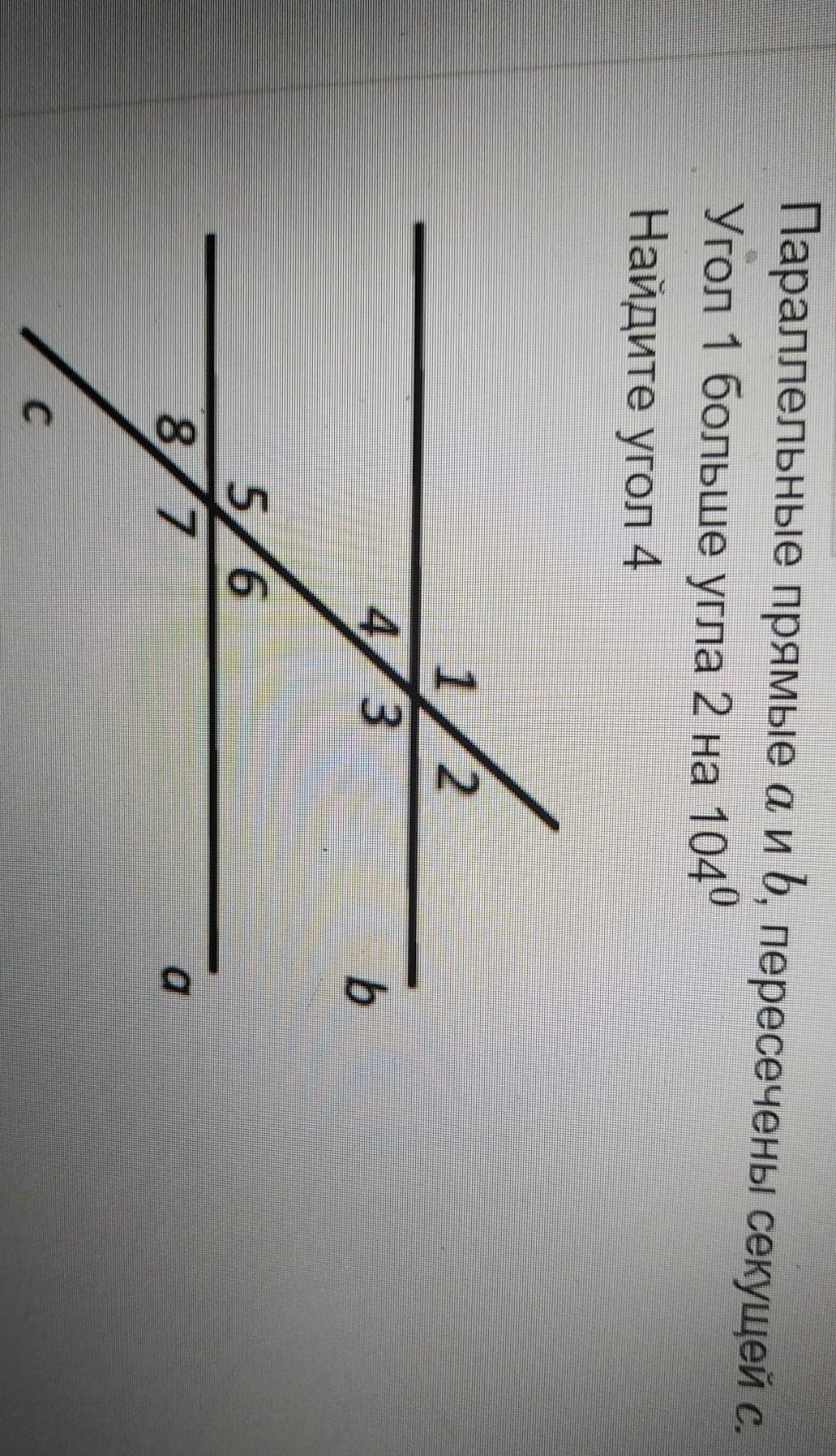 Пусть угол 2 - x, тогда угол 1 - х+104°. ∠1+∠2=180°(как смежные углы. Их сумма равна 180°). Решим уравнение: х+х+104°=180° ⇒ 2х=76° ⇒ х=38°(это ∠2)