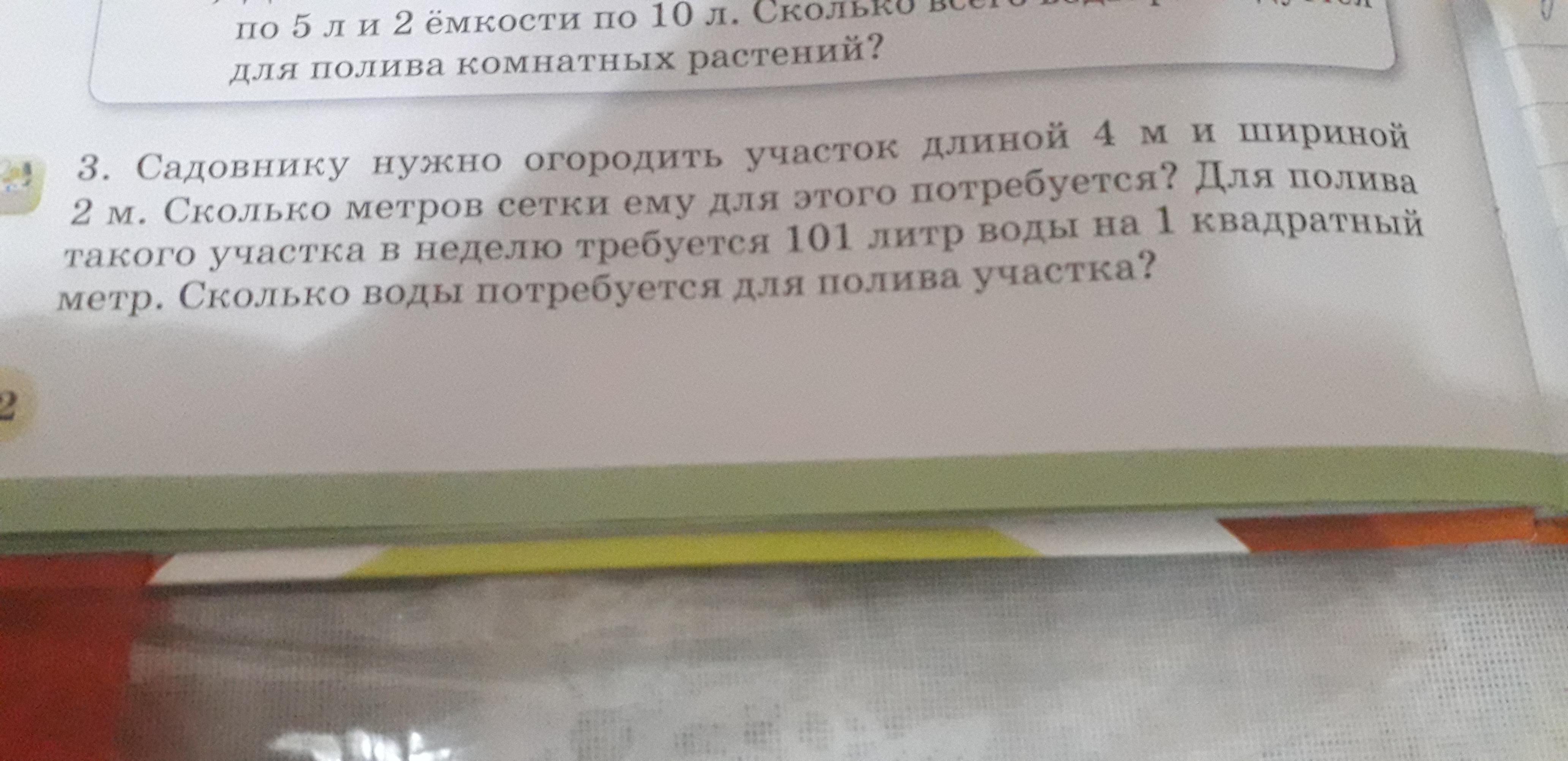 Садовнику нужно городить участок длиной 4м и шириной 2м.Сколько метров сетки ему для этого потребуется? Для полива такого участка в неделю требуется 101литр воды на 1 квадратный метр. Сколько воды потребуется для полива участка?