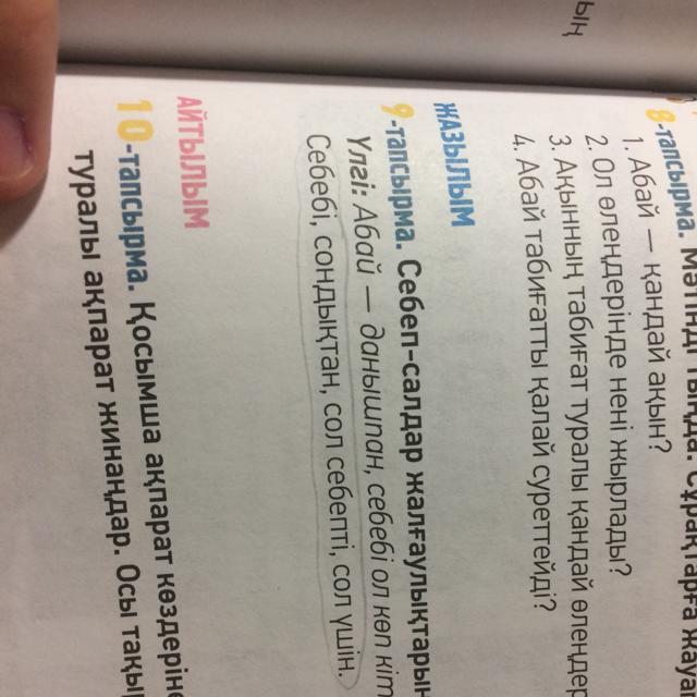 1: Мен Абай атамызды сыйлаймын өйткені ол көп жетістіктерге жеткен.