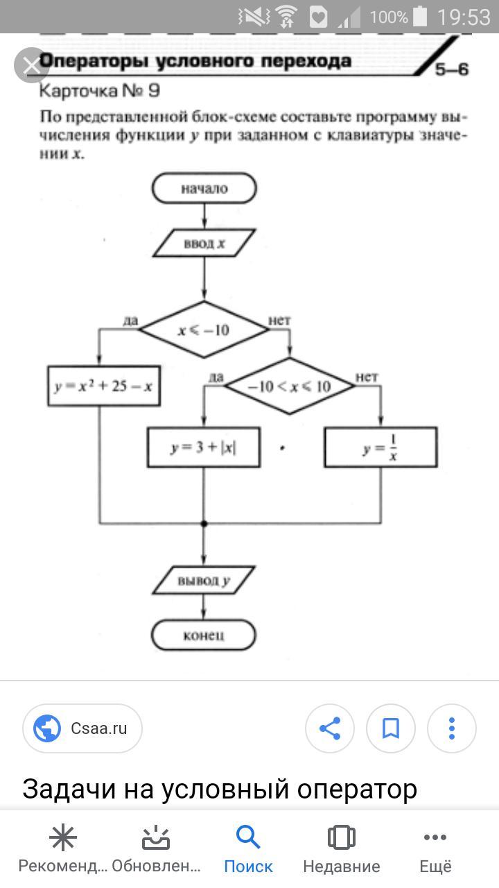 Помогите пожалуйста!! Срочно!! По представленной блок - схеме Составьте программу вычесления функции у при заданном значении с клавиатуры значении х.