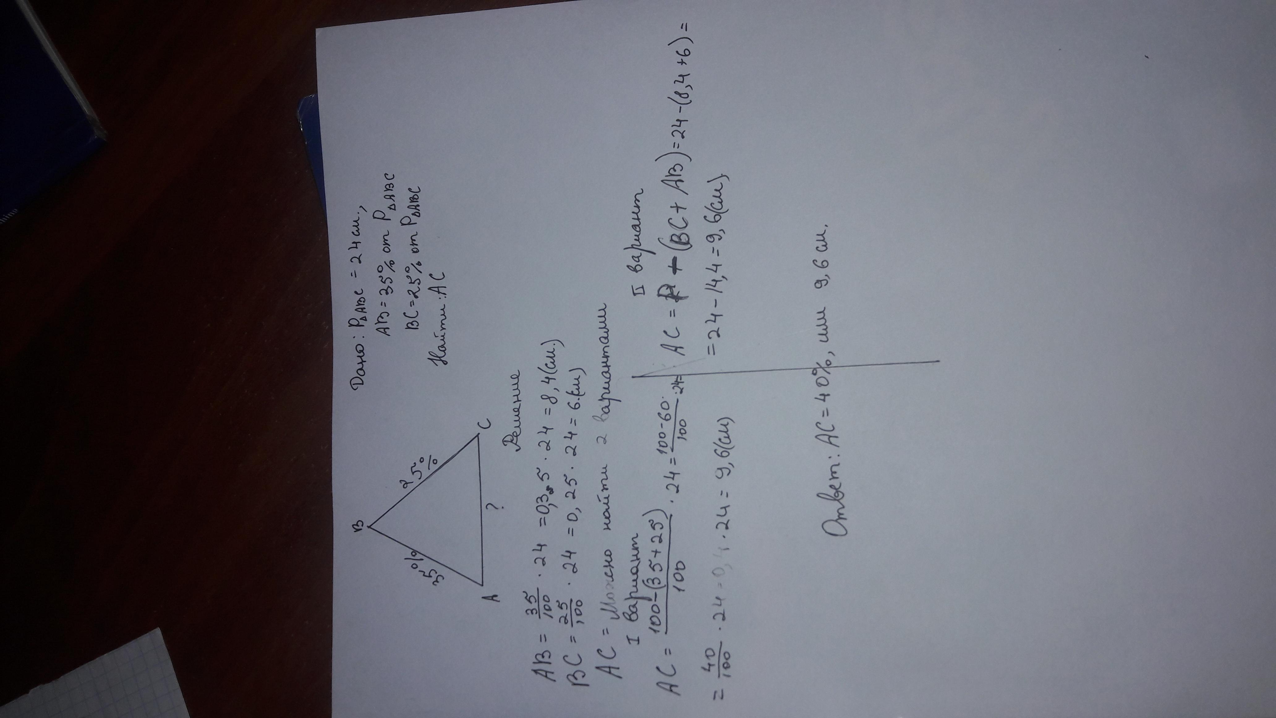 Чтобы найти целое число из процента, нужно процент разделить на 100 и умножить на число от которого берётся процент. В нашем случае - это периметр. Осуществляем эти операции со сторонами, где за условием известны проценты.