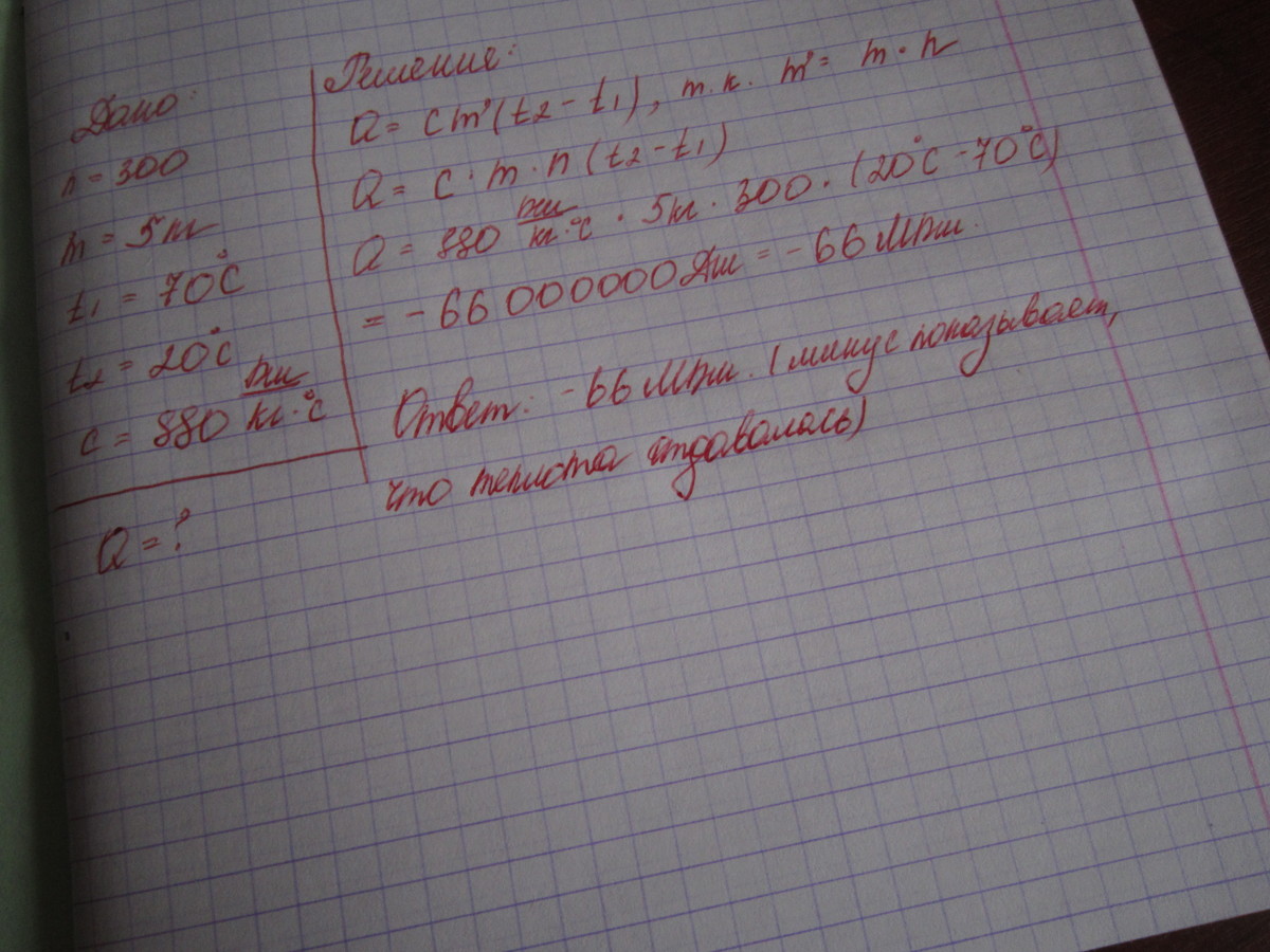 рассчитайте, на какую величину уменьшиться внутрення энергия кирпичной стены, сложенной из 300 кирпичей, при остывании от 70 градусов цельсю до 20 градусов цельсия , масса одного кирпича 5 кг решите полностью пожалуйсиа