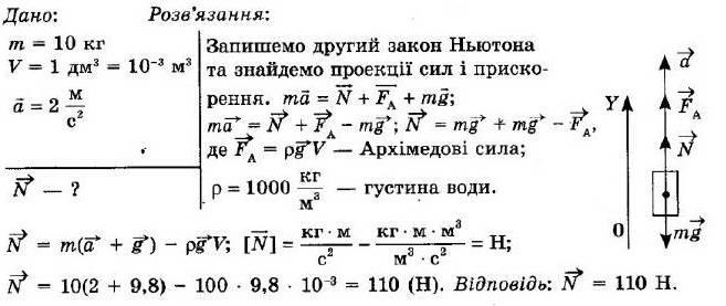 Вантаж масою 10 кг і об'ємом 1 дм³ витягають із води за допомогою мотузки. Визначте силу натягу мотузки, якщо вантаж рухається з прискоренням 2 м/с². Опором води знехтуйте.