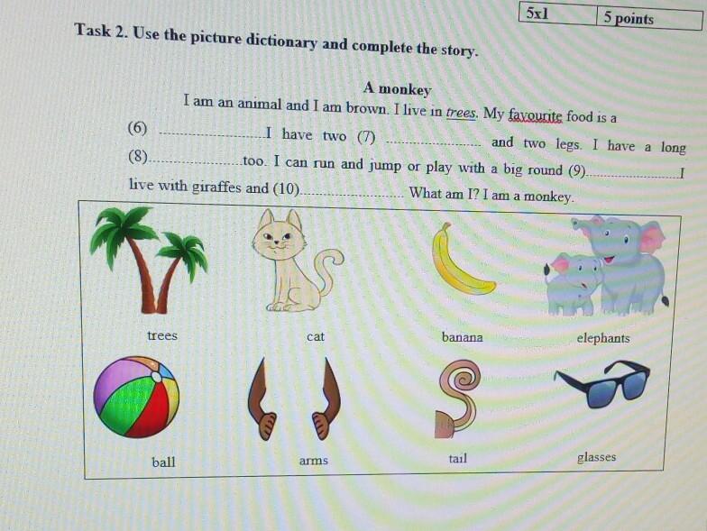 6.Banana 7.Arms.8.Tail.9.Ball.10Elephants