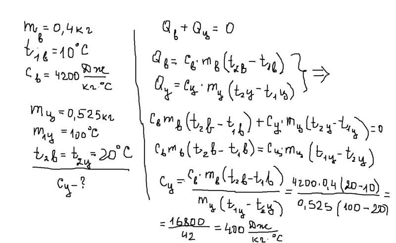 воду массой 400 г взятую при температуре 10 градусов опустили цилиндр массой 525 г нагрели до температуры 100 градусов в результате теплообмена между телами установилась температура 20 градусов Какова удельная теплоемкость цилиндра