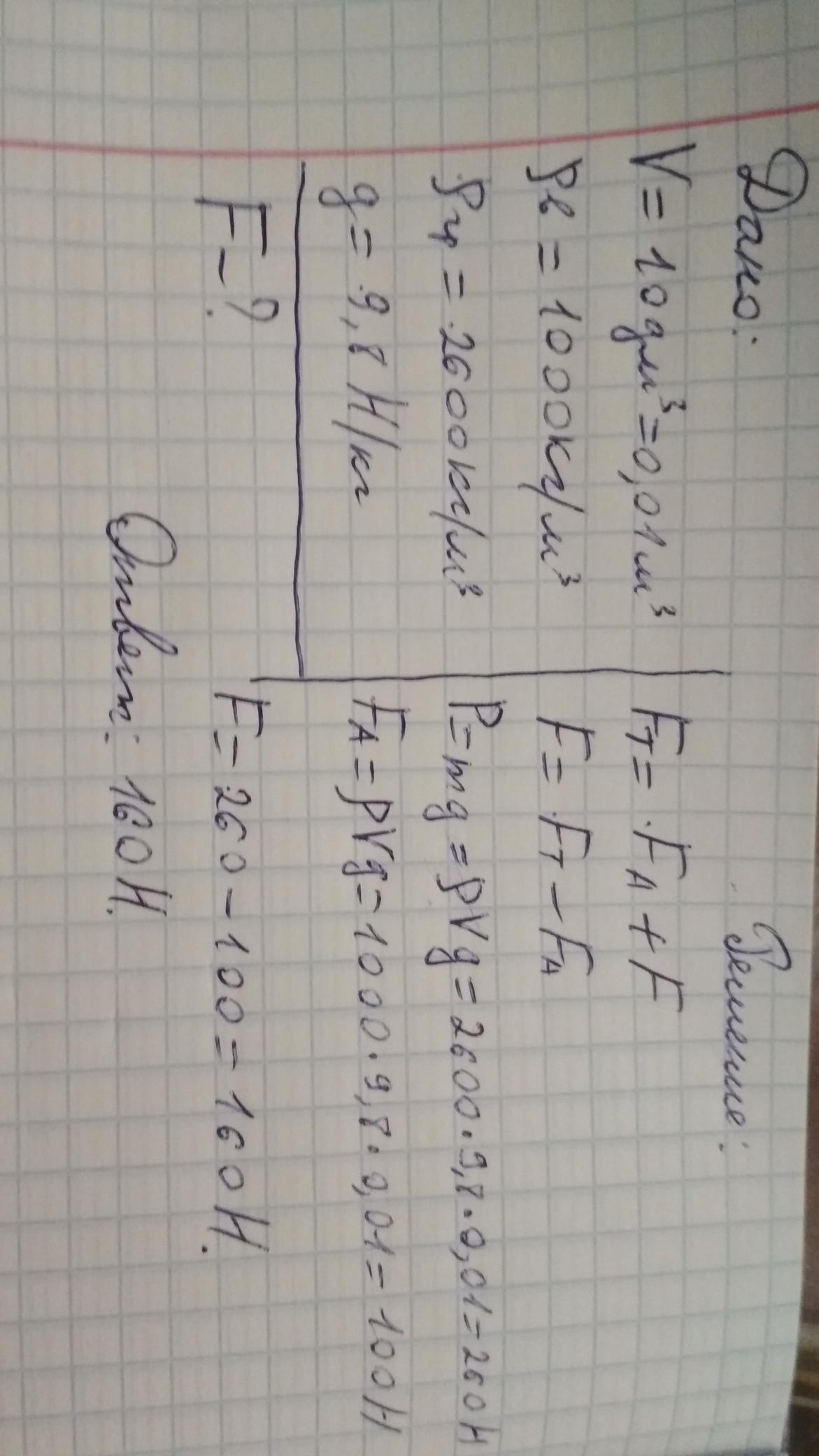 Кусок гранита объёмом 10 дм2 погружен в воду. какую силу необходимо приложить чтобы удержать его в воде? ПОМОГИТЕ ПЖЛСТ