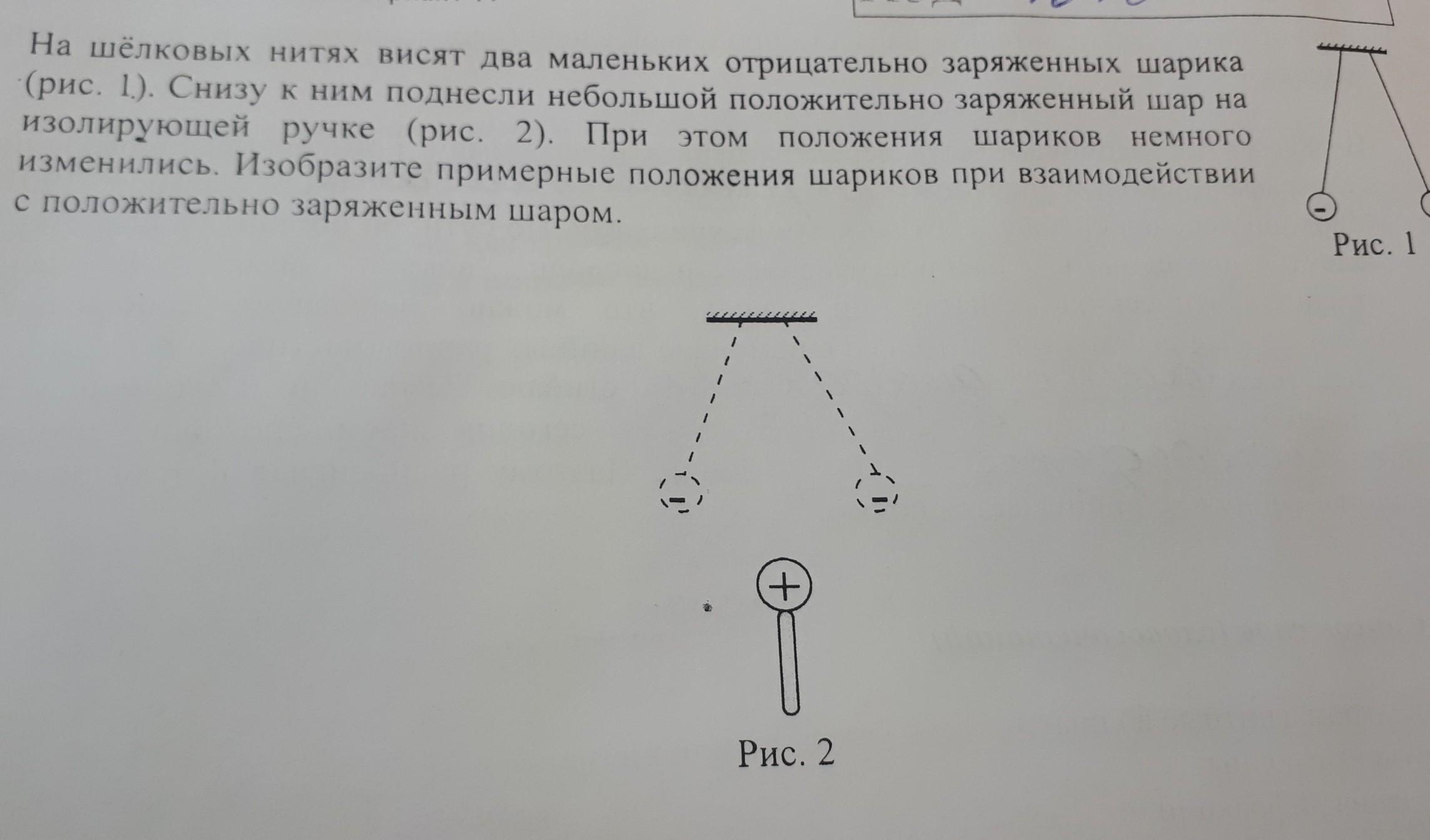 Только не рисуй прям сильно их близко, так как эти два шарика (которые на нитях) заряженны одноименно то они ещё от друг друга отталкиваться будут