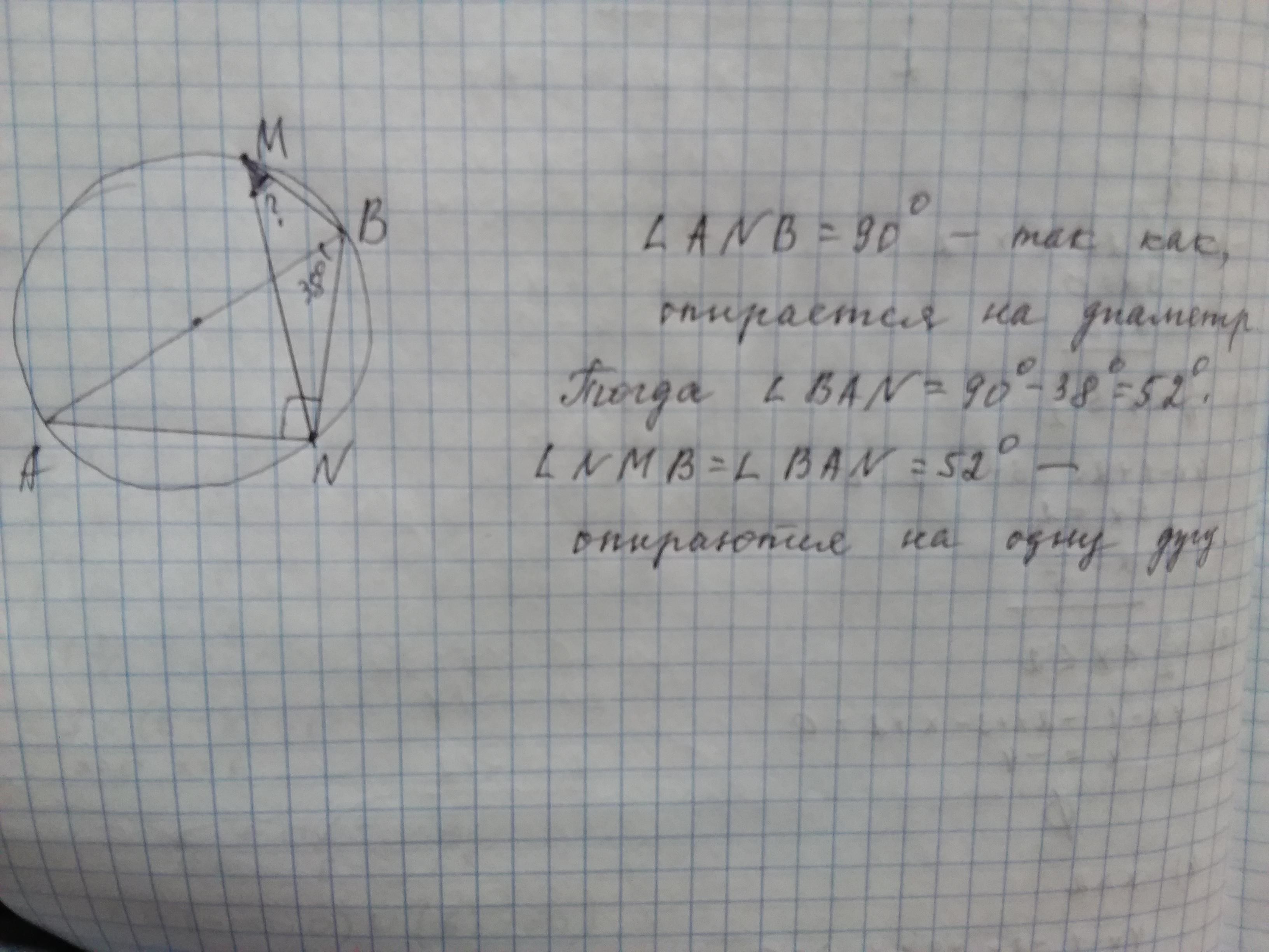 На окружности по разные стороны от диаметра AB взяты точки M и N известно что угол NBA=38градусов. Найдите угол NMB. Ответ дайте в градусах.