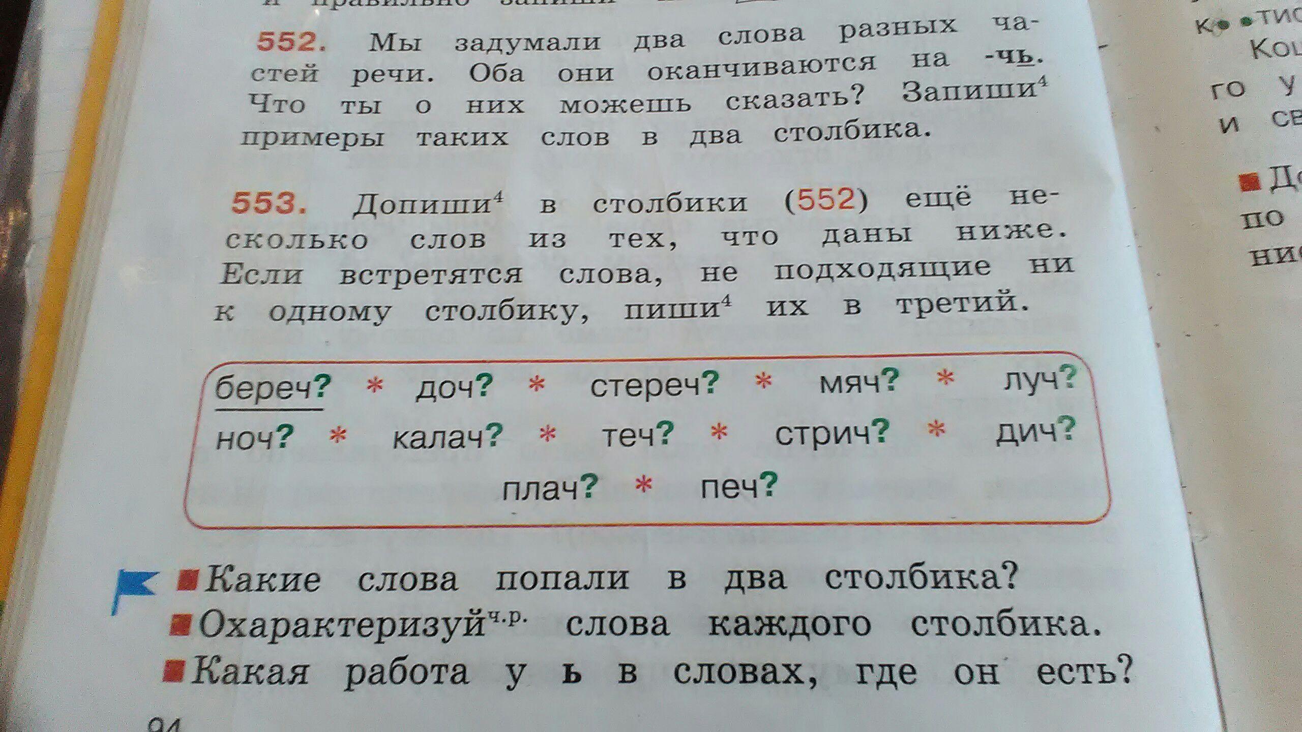 Запиши в столбик 552 ещё несколько слов из тех что даны ниже если 3 слова неподходящий ни к одному столбику Запиши их 3 беречь дочь стеречь мяч Луч ночь Калач стрич стричь печь
